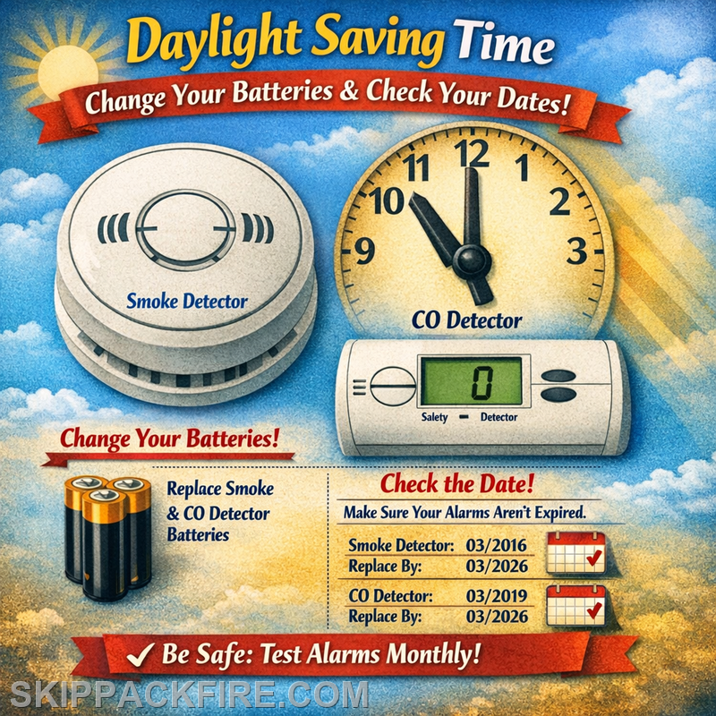 | Daylight saving time starts at 2 am Sunday morning. This is a great time to check your smoke and CO detectors. Approximately 25% of Skippack Fire Company calls in recent years have been related to fire and carbon monoxide (CO) alarms. Most of these incidents are caused by expired batteries or outdated detectors.